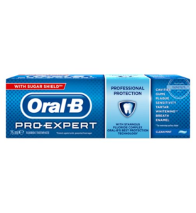 Oral B pro expert toothpaste contains sodium fluoride and stannous fluoride which has been proven to help with plaque/stain/tartar build up, bad breath and prevention of caries.